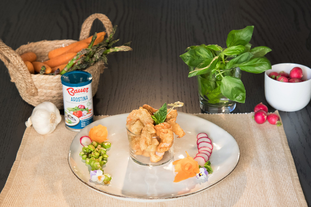 Mazzancolle in pastella di Arostina con verdure primaverili