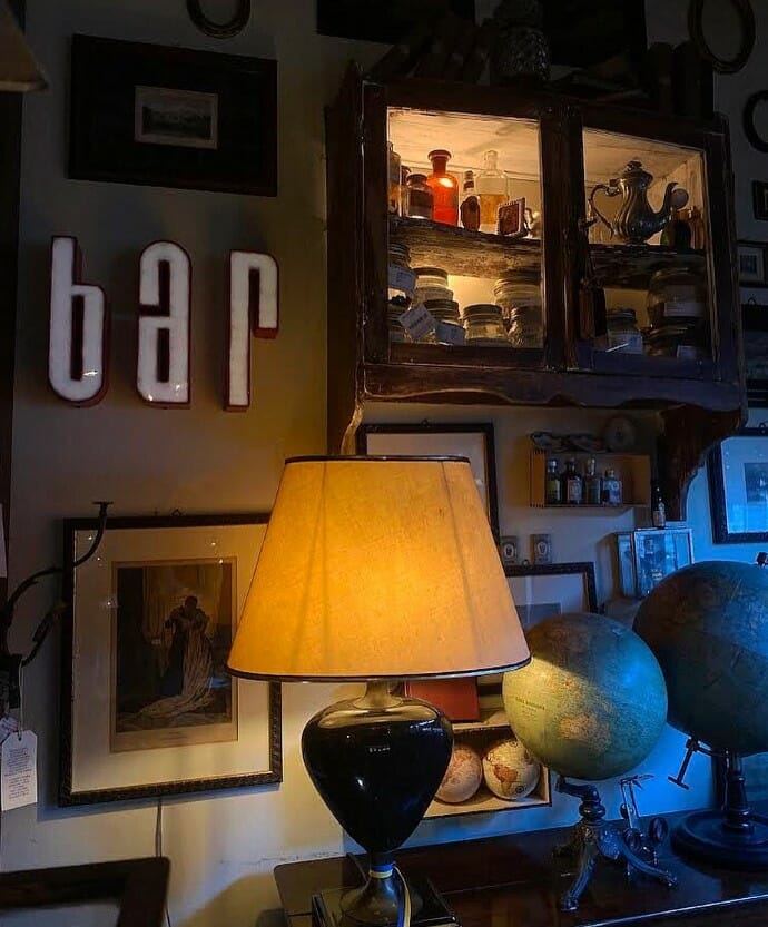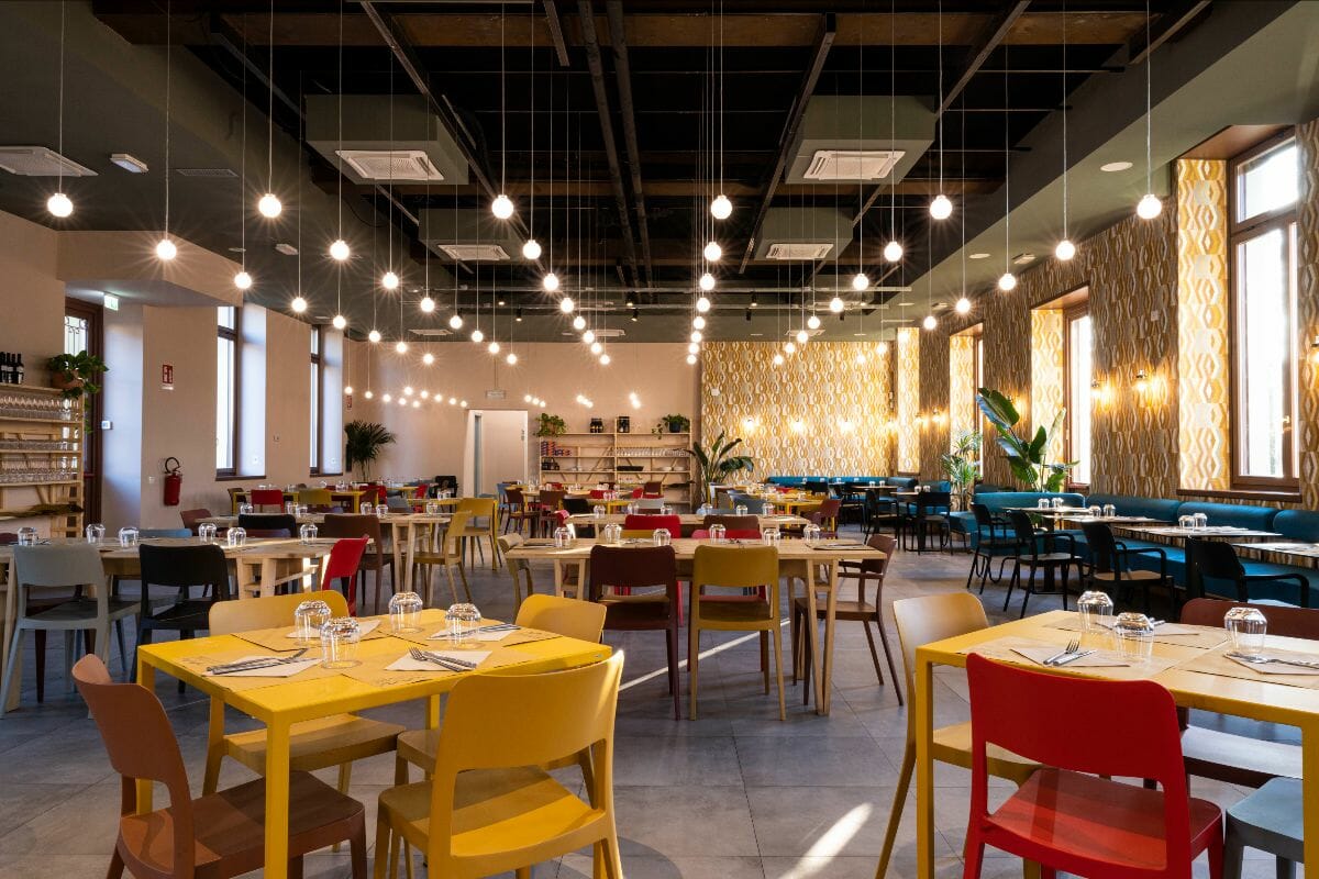In un antico edificio che per anni ha ospitato una scuola comunale, è esso stesso un pezzo di design. Tra cucina aperta con forno a vista, tavoli di legno, rotondi e rettangolari, omaggio a Enzo Mari, e altri color giallo ocra in ferro opaco, morbidi divanetti in tessuto color petrolio, pareti in carta da parati optical-retro.