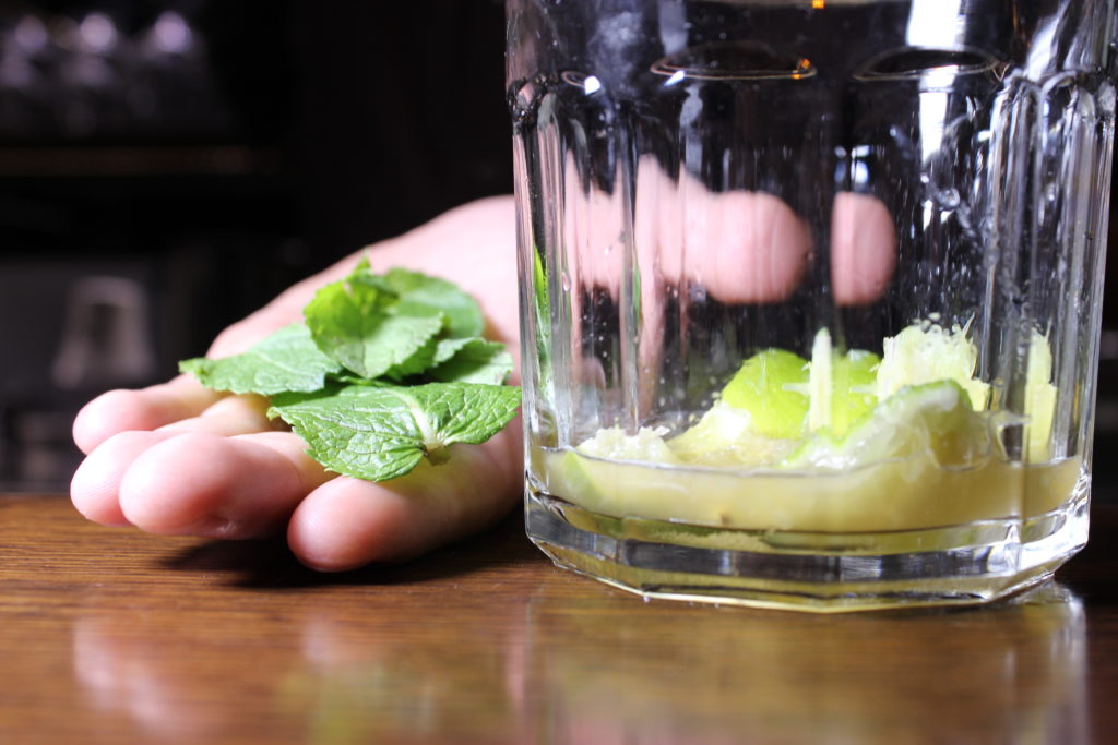 Preparazione: versare il succo di lime fresco nel bicchiere e aggiungere i due cucchiaini di zucchero; mescolare, quindi schiaffeggiare le foglie di menta per risvegliarne i profumi prima di depositarle nel bicchiere. Dare un’ulteriore mescolata, senza pestare, e aggiungere il rum bianco e il ghiaccio a cubi nel bicchiere. Mescolare ancora e completare con un top di soda.