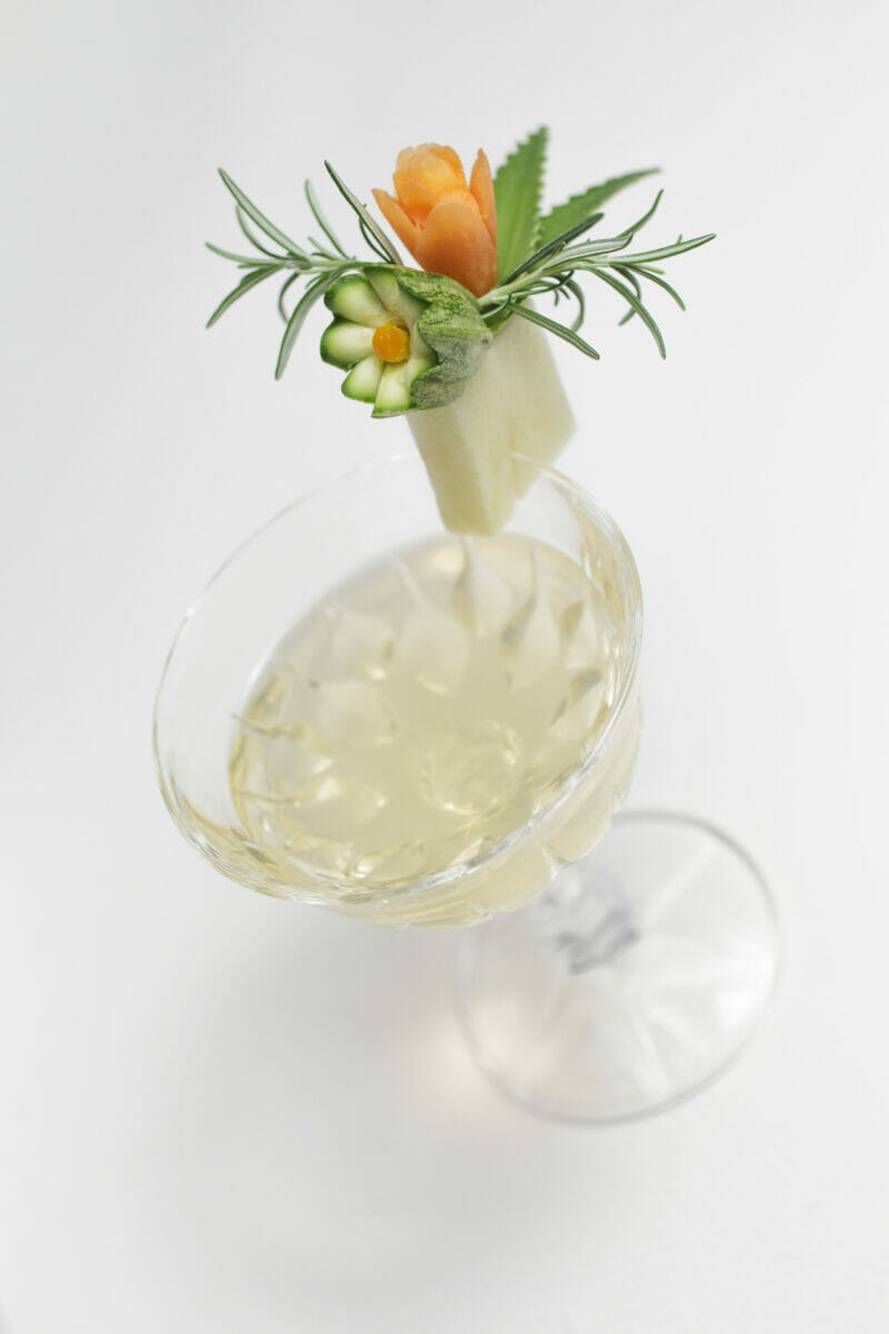 Side di scorza d’arancia (nella foto propongo una guarnizione d’impatto con mela verde, foglie di ananas, zucchina, carota, scorza arancia e rosmarino, ideale per competizioni o pubblicazioni)