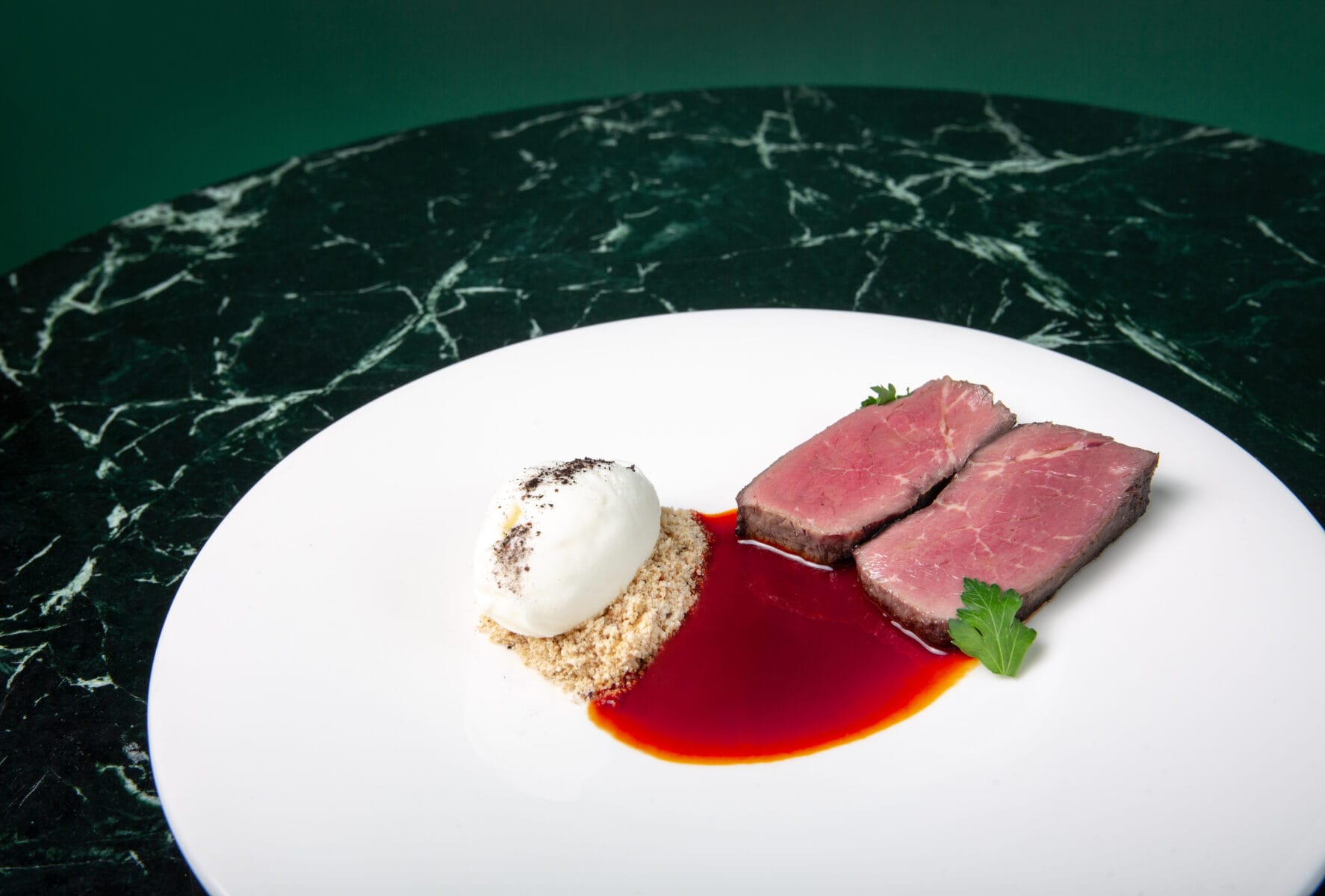 Si parte dalla Londra del 1971 al ritmo di “Brown sugar”, indimenticabile e (all’epoca) contestato successo dei Rolling Stones, che lo chef ha tradotto in piatto altrettanto “estremo” a base di lingua di vitello brasata, zucchero grezzo, birra scura, anice, caffè e kimch. L’abbinamento è con uno speziato cocktail Brown Sugar con rum e profumato di zenzero e lime.