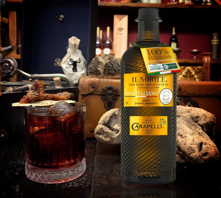 Un Negroni molto particolare, un cocktail che può essere anche invecchiato per 50 giorni in bottiglia di Olio “il Nobile” Carapelli, così da fornire il giusto retrogusto intenso dell’olio. Il tutto servito con prodotti 100% naturali per esaltarne ancora di più il sapore.