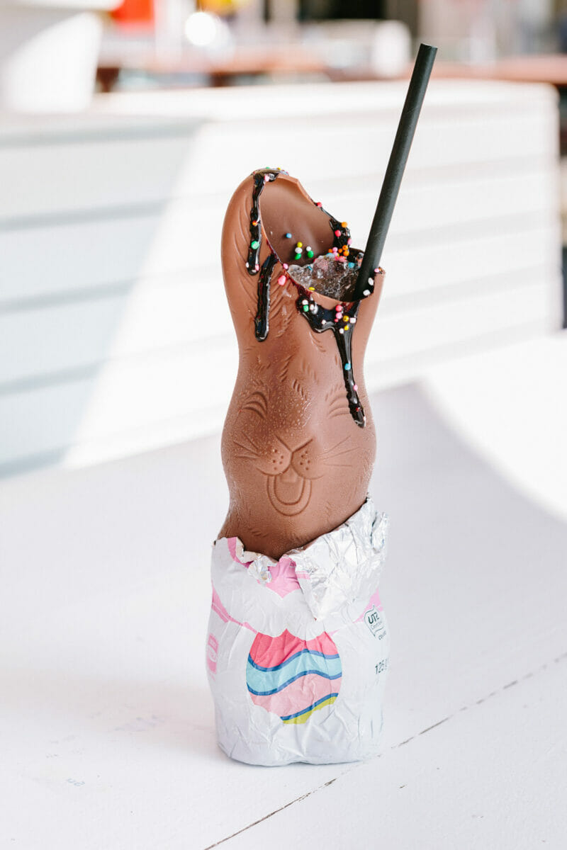 Fare un’apertura nelle orecchie sulla parte alta della testa del coniglietto di cioccolato (lasciare un po’ dell’involucro, aiuterà a evitare lo scioglimento del cioccolato e di attaccare lo stesso alle dita), mescolare tutti gli ingredienti (tranne la guarnizione) in un bicchiere da miscelazione riempito a 3⁄4 tazza di ghiaccio tritato, quindi versare all’interno del coniglietto.