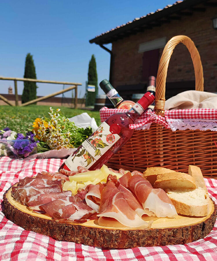 Nell’aria i colori e i profumi della primavera, sul prato una tovaglia da condividere con gli amici, nel calice un buon rosato, sul tagliere la bruschetta con l’olio extravergine prodotto in tenuta, e poi la finocchiona, il capocollo, i pecorini di Pienza, la panzanella.