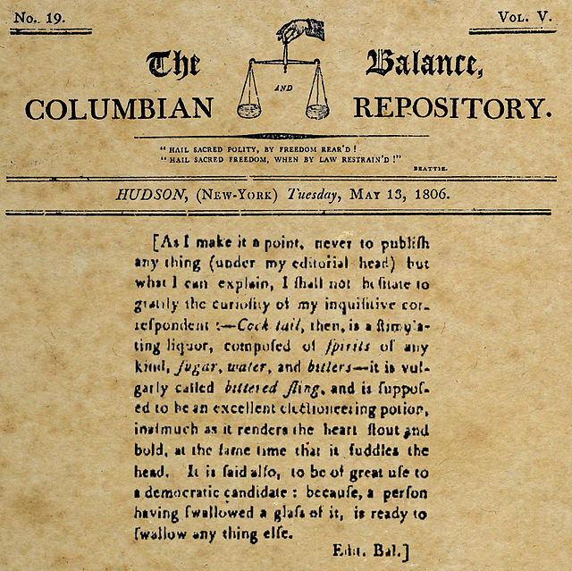 La leggenda di Betsy Floyagan, in particolare, appare in contrasto con il fatto che la prima apparizione documentata della parola cocktail risale al 1806, ben prima della Guerra di Secessione, quando sul quotidiano americano Balance Columbian Repository, il 13 maggio (sì, il giorno in cui si celebra oggi il World Cocktail Day) fu pubblicata questa definizione: “Cocktail is a stimulating liquor composed of spirit of any kind, sugar, water and bitters” (il cocktail è un liquore stimolante composto da distillati di qualsiasi tipo, zucchero, acqua e amari).