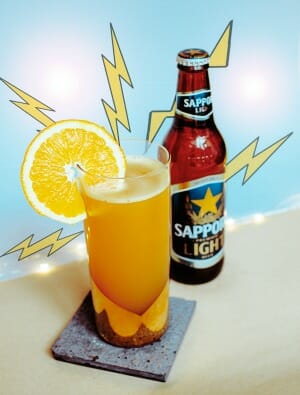 Miscelare nel bicchiere succo d’arancia e sciroppo di miele, completare con birra Sapporo e bitter all’arancia, quindi mescolare delicatamente