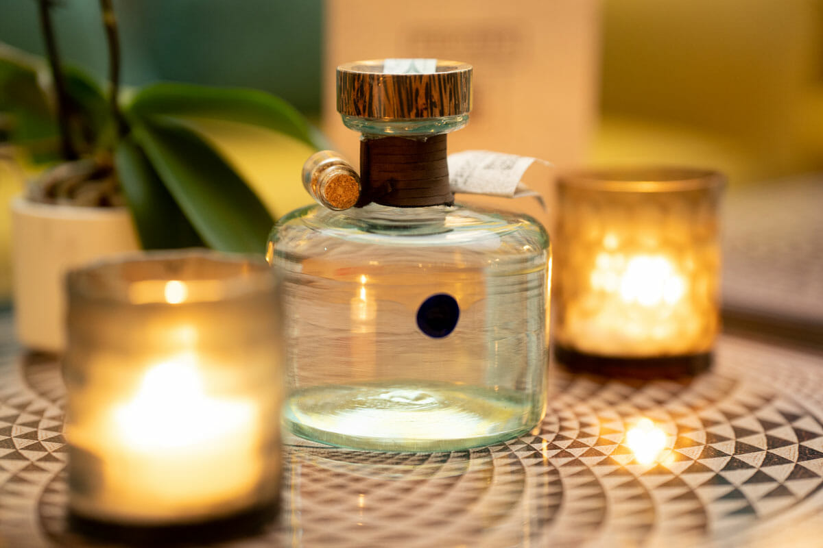Eleganti e sofisticati anche i tappi, ricavati da legno di palma e realizzati da un collettivo di artigiani di Kilifi. Lo stesso vale per il cinturino in pelle che annoda il collo della bottiglia.