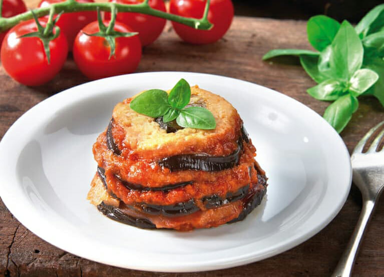 - Sistemare sul piano da lavoro 8 stampini di alluminio (usa e getta) ed adagiare in ognuno 1 foglia di basilico, un cucchiaio di mix di formaggi, un cucchiaio di salsa e una fetta di melanzana. Procedere allo stesso modo sino al riempimento degli stampini e terminare la composizione con una fettina di melanzana pressando delicatamente in modo da pareggiare gli strati con il bordo degli stampini. Richiudere gli stampini con carta alluminio e tenere da parte (vedi consigli).