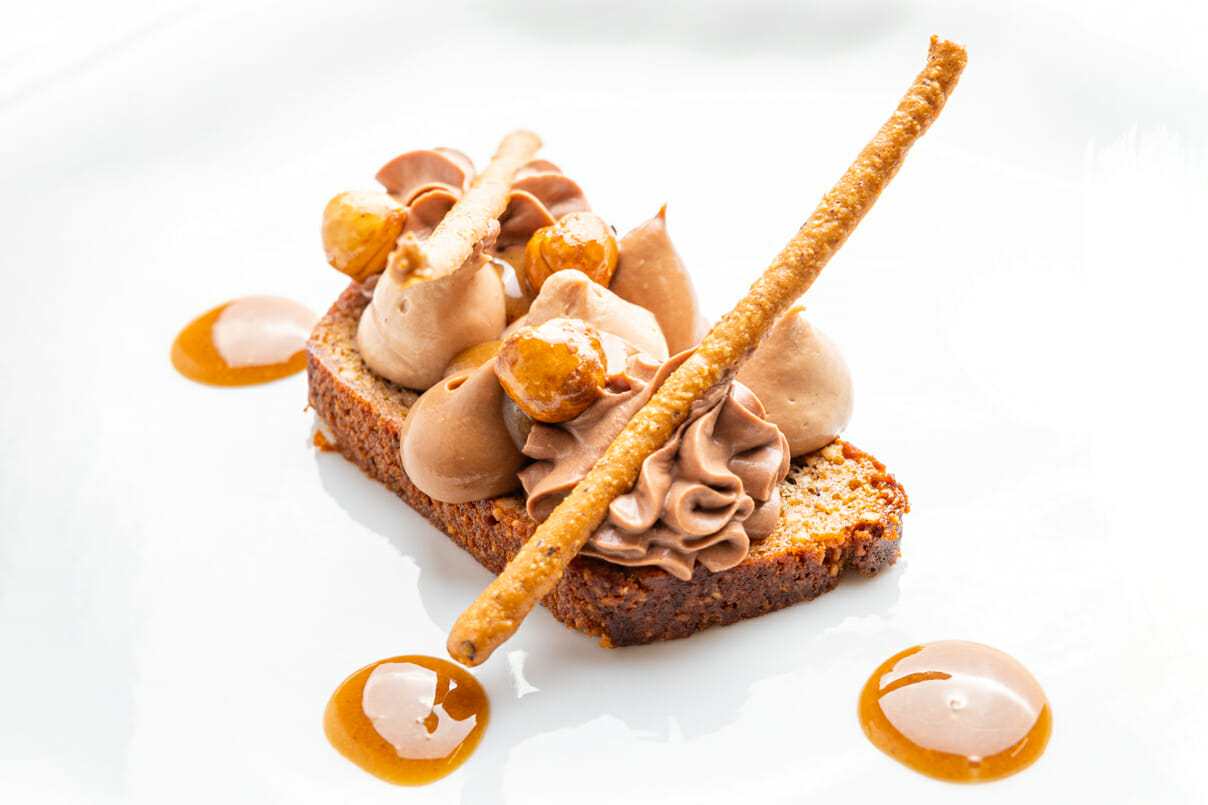 Come nel dessert Gianduja, caffè e nocciola, in cui un cake al gianduja è accompagnato da nocciole caramellate al forno, grissini alle nocciole, ganache montata al gianduja fondente e mousse di gianduja al latte.