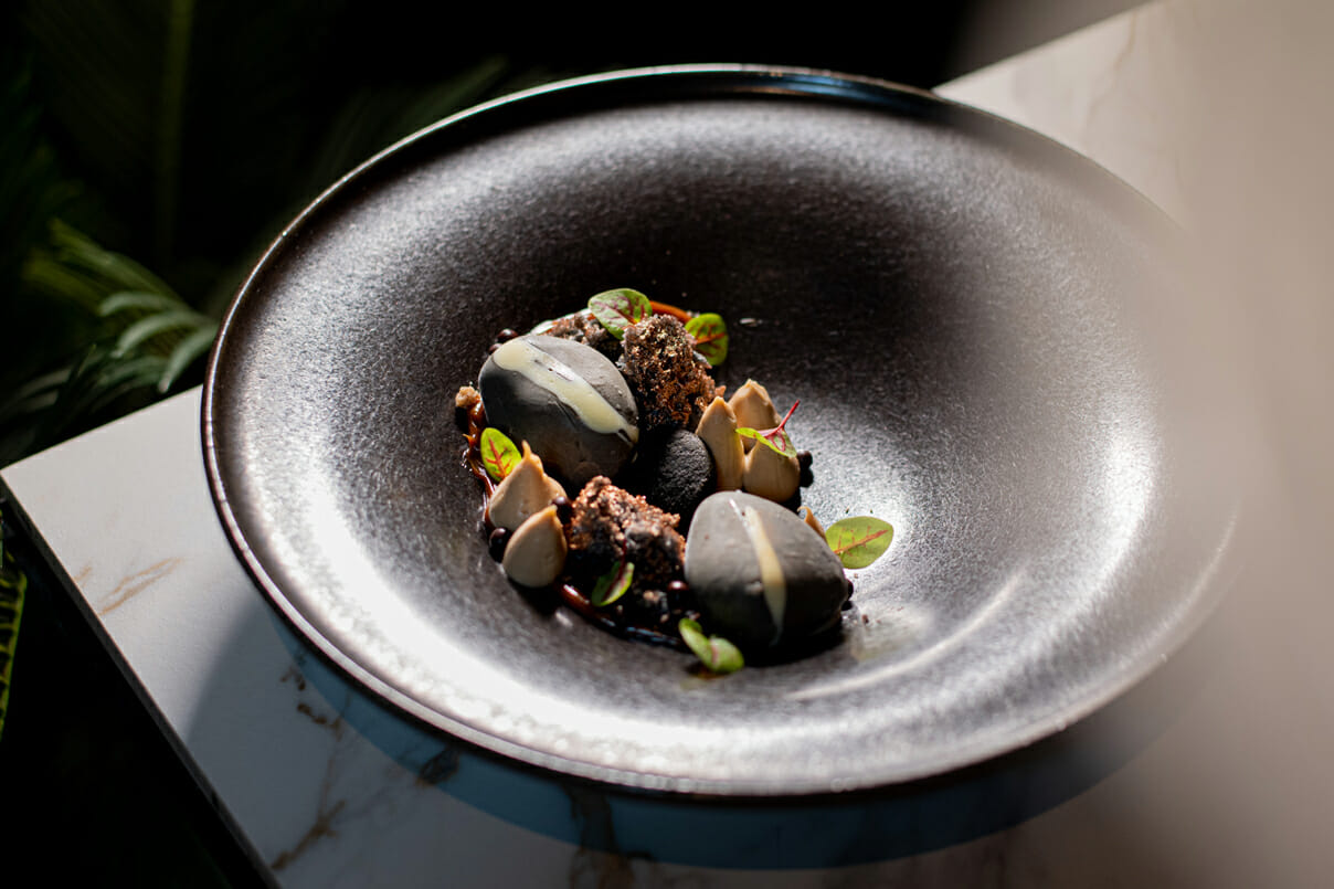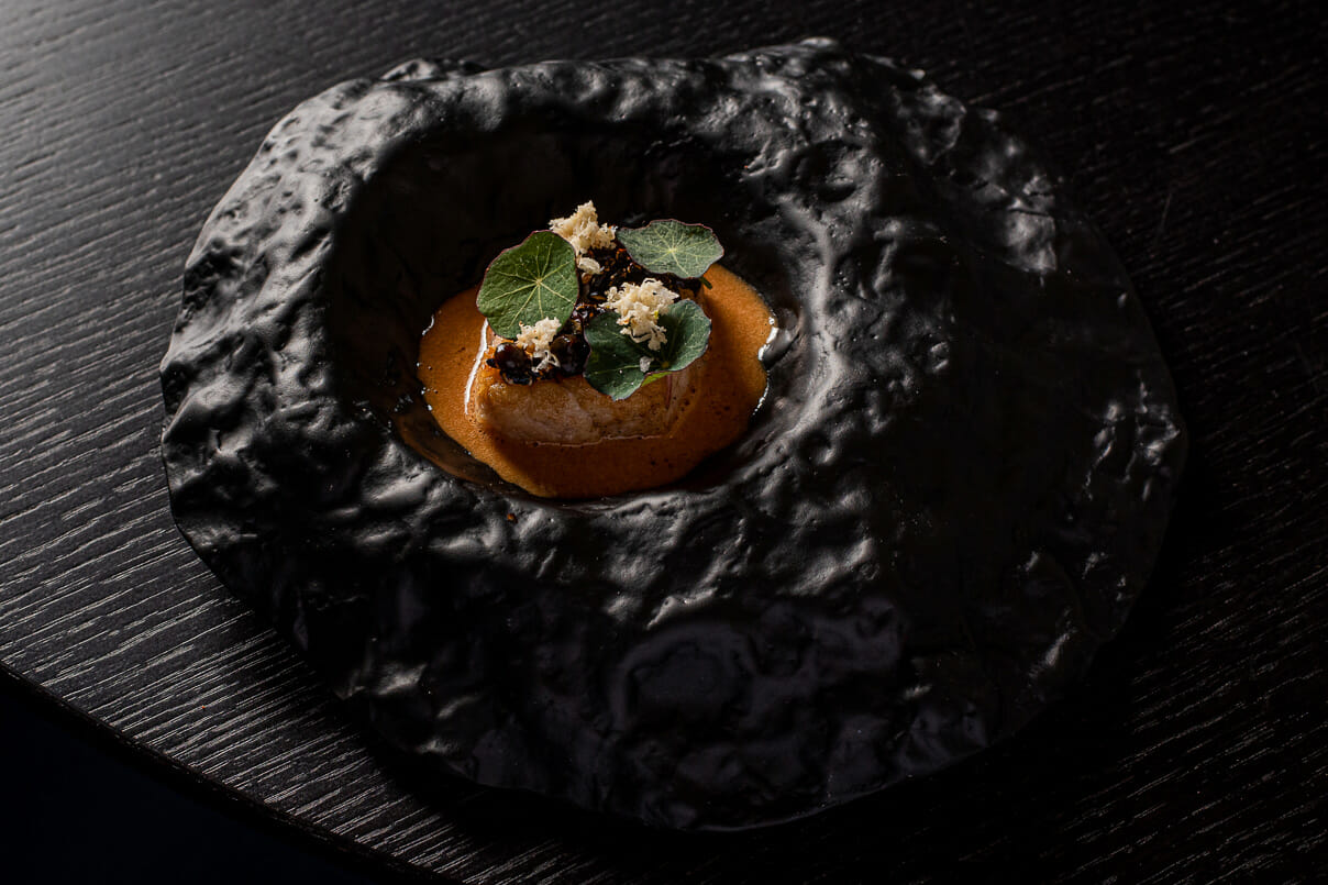 Come nel caso dell’antipasto Animella, fondo di scoglio, caffè, riso nero e rafano, creato a partire dal quinto quarto, qui abbinato con un fondo di scoglio (il contrasto tra terra e mare è fil rouge della cucina di Minchillo) preparato dallo chef con 18 diversi tipi di pesce e crostacei, per un risultato vellutato e sapido. A completare il piatto, vi sono il riso nero soffiato, che apporta croccantezza, e rafano e caffè specialty Hawai Kona, che conferiscono piccantezza e amarezza.
