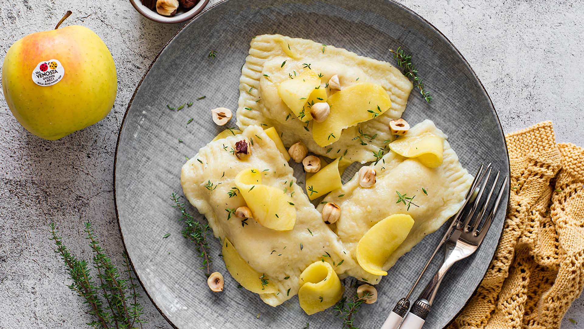Delicati, cremosi e con un cuore irresistibilmente filante: i ravioli di patate ripieni di mele Golden Delicious e formaggio sono un’elegante proposta perfetta per un pranzo speciale o una cena in cui coccolarsi con gusto. L’impasto soffice a base di patate racchiude un ripieno sorprendente in cui la dolcezza delle mele incontra la sapidità del formaggio, regalando una sinfonia di sapori raffinati ed equilibrati. Questa ricetta è stata realizzata da Julia Morat