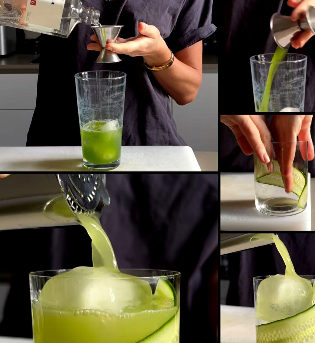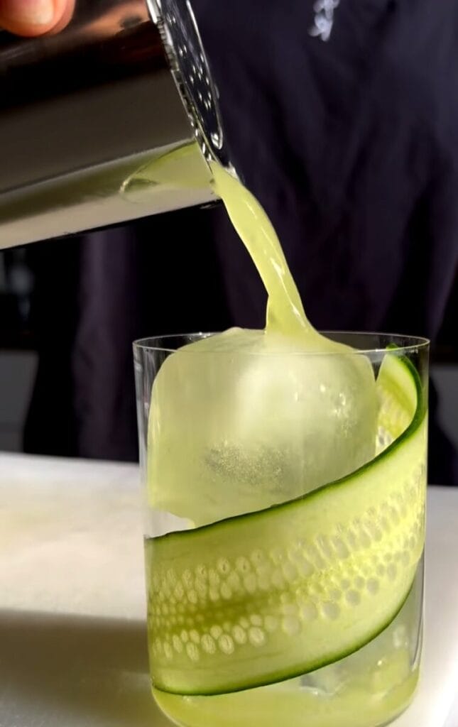 Tagliare longitudinalmente una fettina di cetriolo da utilizzare per la decorazione, quindi grattugiare il resto dell’ortaggio e spremerlo usando un asciugamano da cucina per ottenere più succo possibile. Mettere in uno shaker con ghiaccio 80 ml di succo di cetriolo e gli altri ingredienti (comprese le eventuali bacche di ginepro) e agitare bene per una ventina di secondi, quindi filtrare il tutto nel bicchiere riempito di ghiaccio.