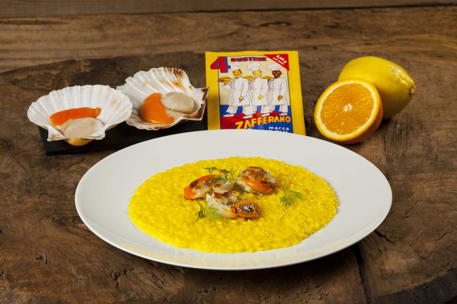 Nel frattempo, prendete le capesante intere e conditele con timo e olio, riscaldate una padella antiaderente e scottatele sulla piastra rovente un minuto per lato. Una volta cotte, disponetele sul risotto con la buccia d’arancia grattugiata, qualche foglia di finocchietto fresco e servite.