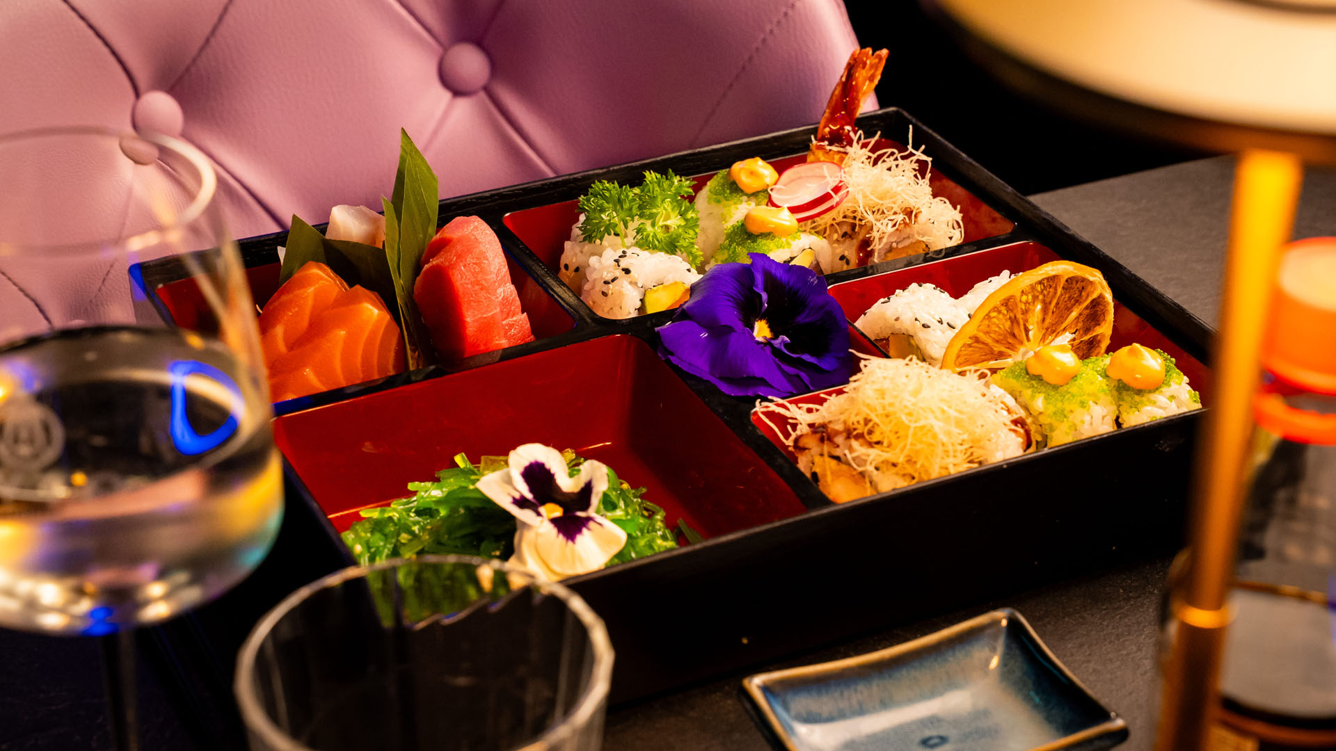 Appena varcata la soglia, ci si trova davanti a una vera sorpresa: un ambiente disegnato dall’architetto Fabio La Commara con ispirazioni industrial chic, elementi teatrali, giochi di specchi e un lampadario monumentale che cattura lo sguardo. Il locale si sviluppa su due piani, ognuno con la sua atmosfera. Al piano terra domina il grande spazio conviviale, perfetto per show cooking e cene con performance live. Al piano superiore, invece, le luci si abbassano e l’ambiente si fa più intimo, con angoli pensati per chi vuole rilassarsi o cantare al karaoke in perfetto stile nipponico.