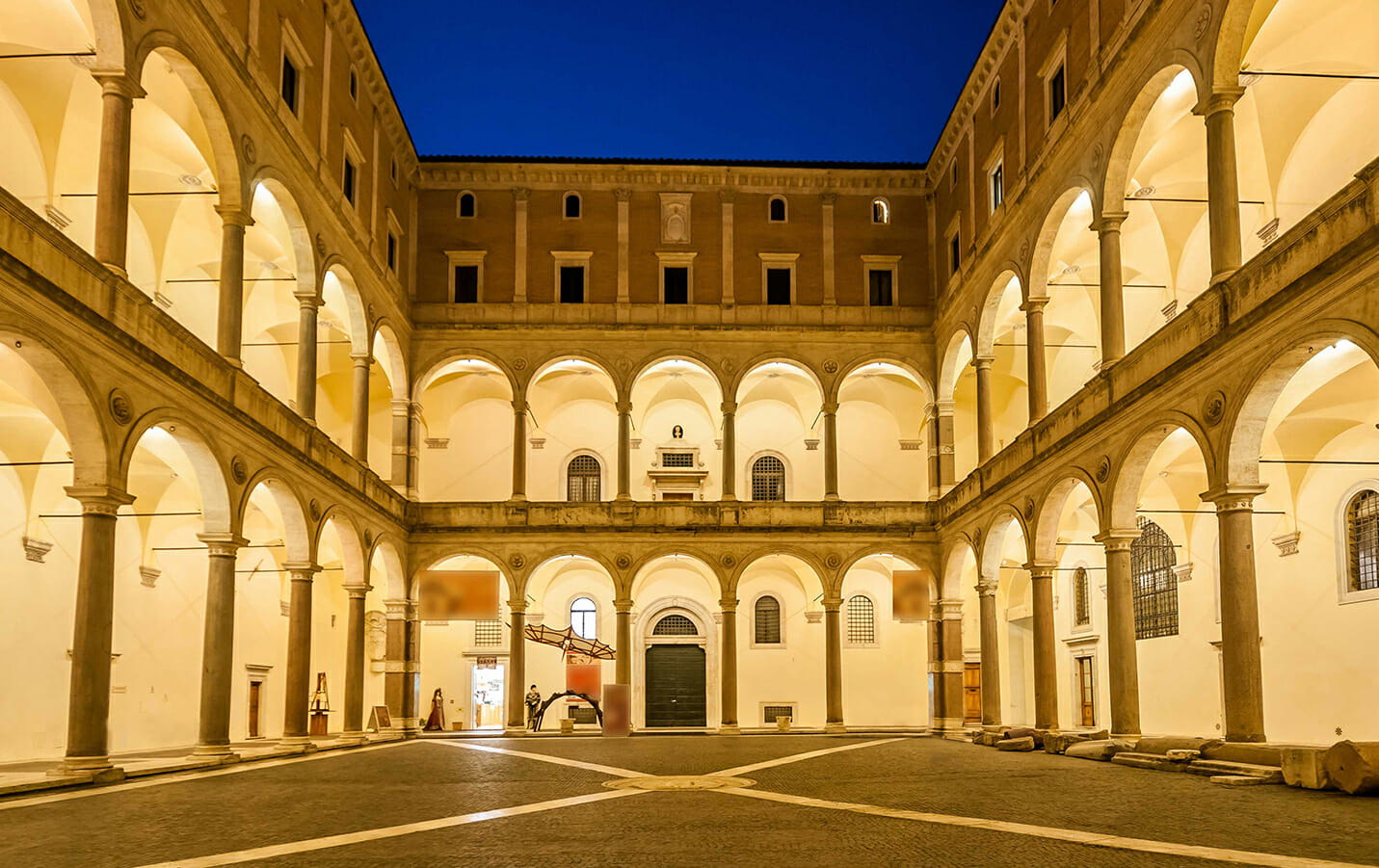 La sua maestosità svetta su Corso Vittorio Emanuele II e sull’omonima piazza a due passi da Campo de’ Fiori. Oltre al cortile del Bramante, il Palazzo ospita il Salone dei Cento Giorni affrescato da Vasari e l’Aula Magna, o Sala Riaria, con affreschi del ‘700 e il celebre orologio dipinto del Baciccia.