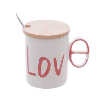 Simpatica tazza mug con scritta Love. La ricercatezza delle forme e del decoro si unisce alla praticità e alla funzionalità: la tazza è dotata di un comodo coperchio per mantenere l’infusione senza dispersione di calore e di un cucchiaino per mischiare al meglio zucchero e miele. Costa 6,90 euro.