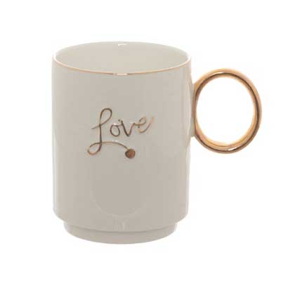 Tazza Mug con scritta “Love”. Il manico permette di sollevare la tazza senza scottarsi. Prezzo: 6,90 euro.