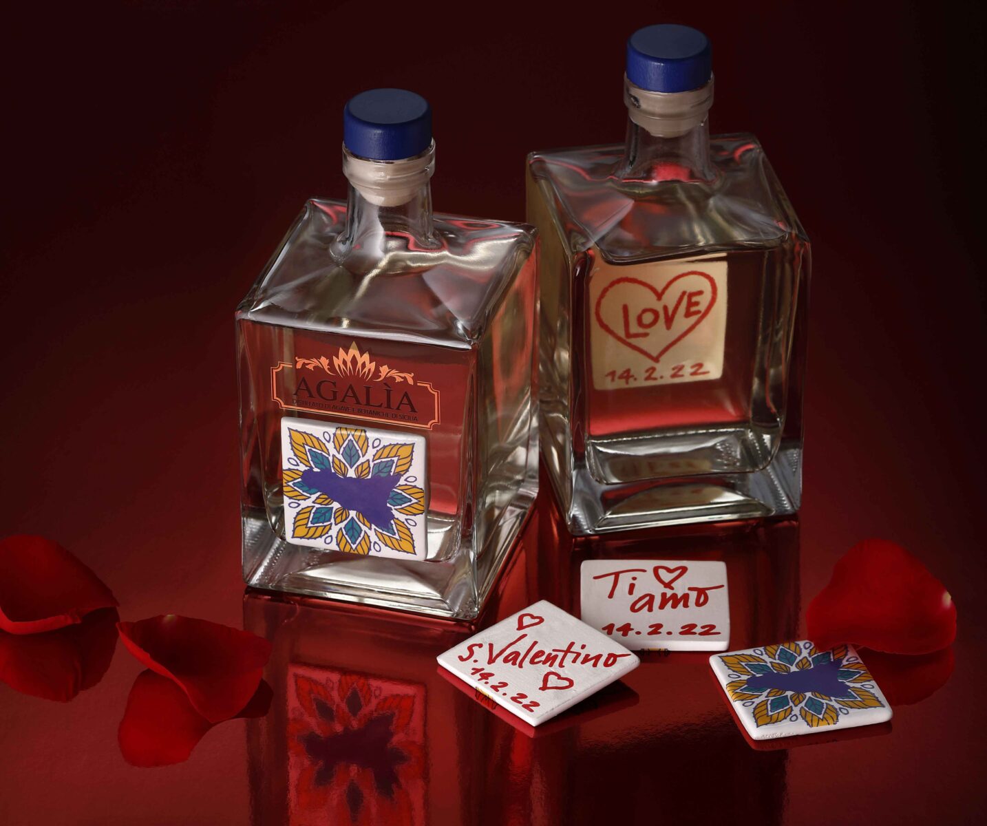 Agalìa, distillato premium d’agave e botaniche di Sicilia, si trasforma in un suggestivo messaggero d’amore nell’occasione più romantica dell’anno, permettendo la personalizzazione di ciascuna bottiglia in maniera inedita. Il vetro trasparente della bottiglia che custodisce il distillato lascia trasparire parole d’amore che sono scritte con inchiostro rosso sulla piastrella di ceramica di Caltagirone, applicata rigorosamente a mano. Con Agalìa, dire “Ti Amo” ha un gusto nuovo.