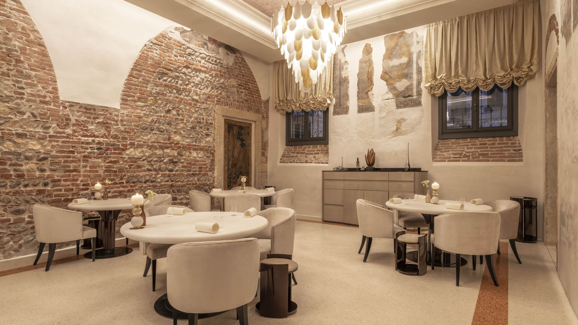 La magia inizia ancor prima di sedersi a tavola. Il Palazzo Soave, gioiello del Quattrocento, offre un’ambientazione suggestiva, resa ancora più intima dalla cantina situata al piano interrato. Qui, circondati da mattoni a vista e reperti di epoca romana, gli ospiti possono scegliere tra oltre 800 etichette di vino, un preludio perfetto per il viaggio gastronomico che li attende.
