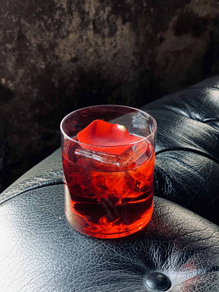 Con la tecnica shake and strain, versare tutti gli ingredienti in uno shaker colmo di ghiaccio. Shakerare energicamente. Filtrare il liquido attraverso un colino in un bicchiere Old Fashioned precedentemente raffreddato. Guarnire con un petalo di rosa.