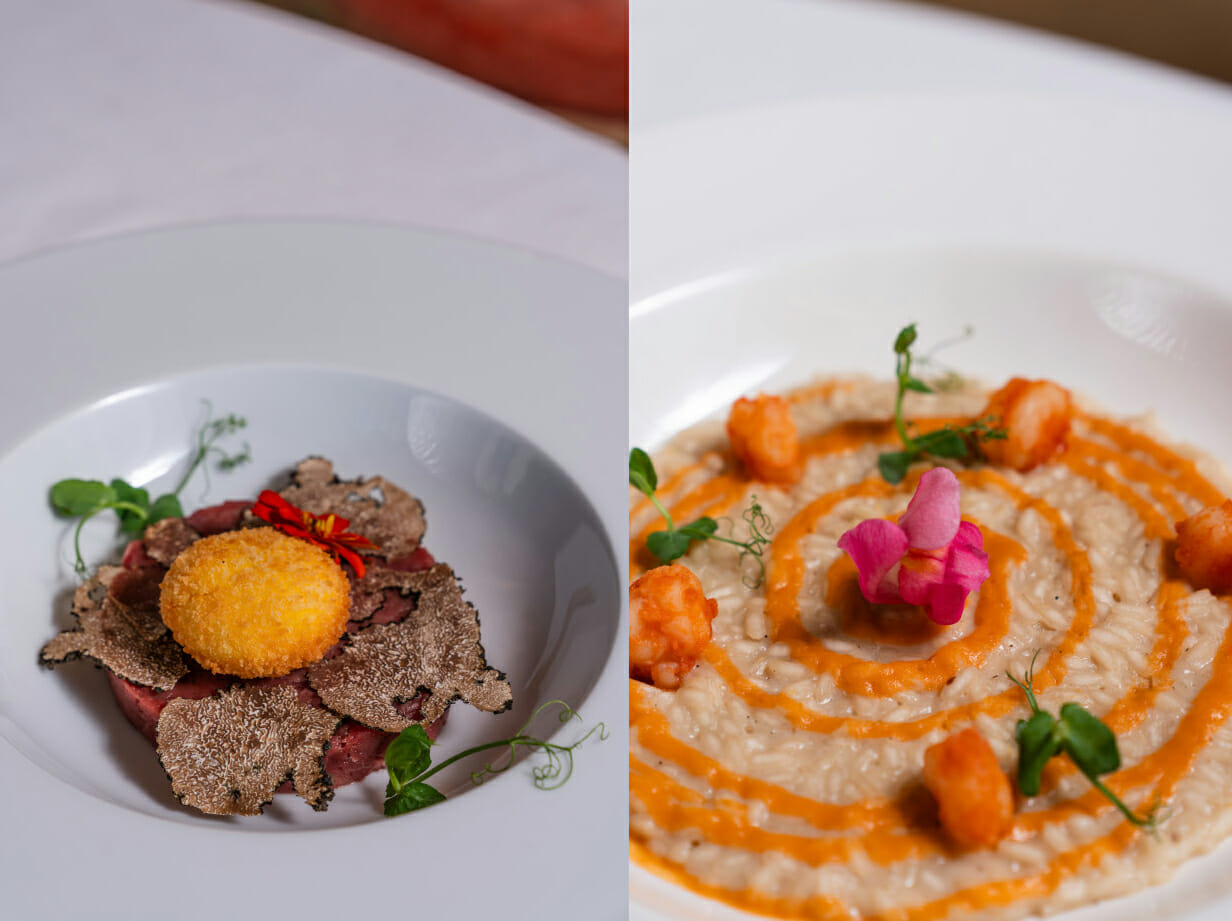 Completa il tris di proposte di mare, il tradizionale Baccalà mantecato, sfoglie di polenta al nero di seppia e cipolla rossa all’agro. La proposta di terra, invece, prevede una classica Tartare di fassona tuorlo croccante e tartufo nero estivo e un divertente Bon-bon di Morlacco del Grappa con composta di pomodoro verde, che regala una deliziosa punta di acidità.