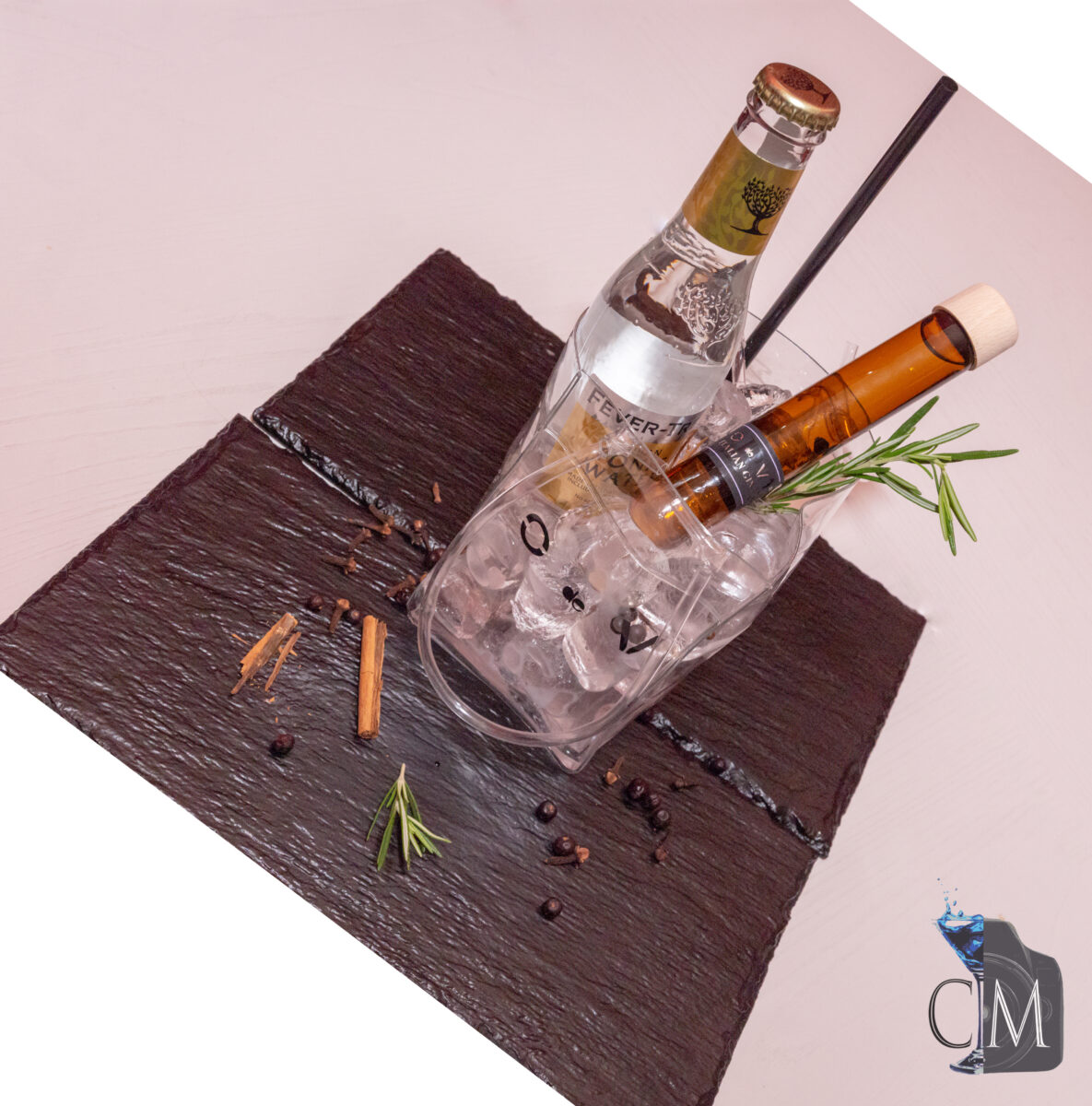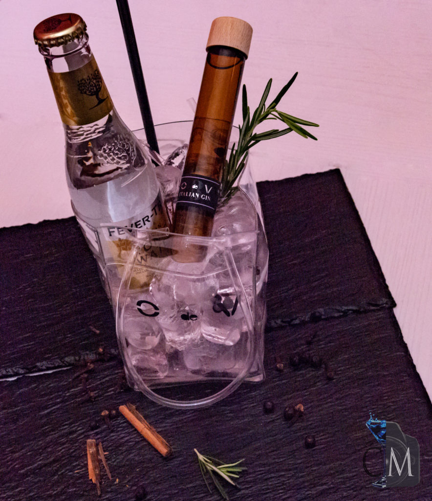 Servire gin e tonica separati, riempire la cocktail bag di O de V con ghiaccio, con rosmarino, chiodi di garofano e cannella bruciati leggermente con il cannello.
