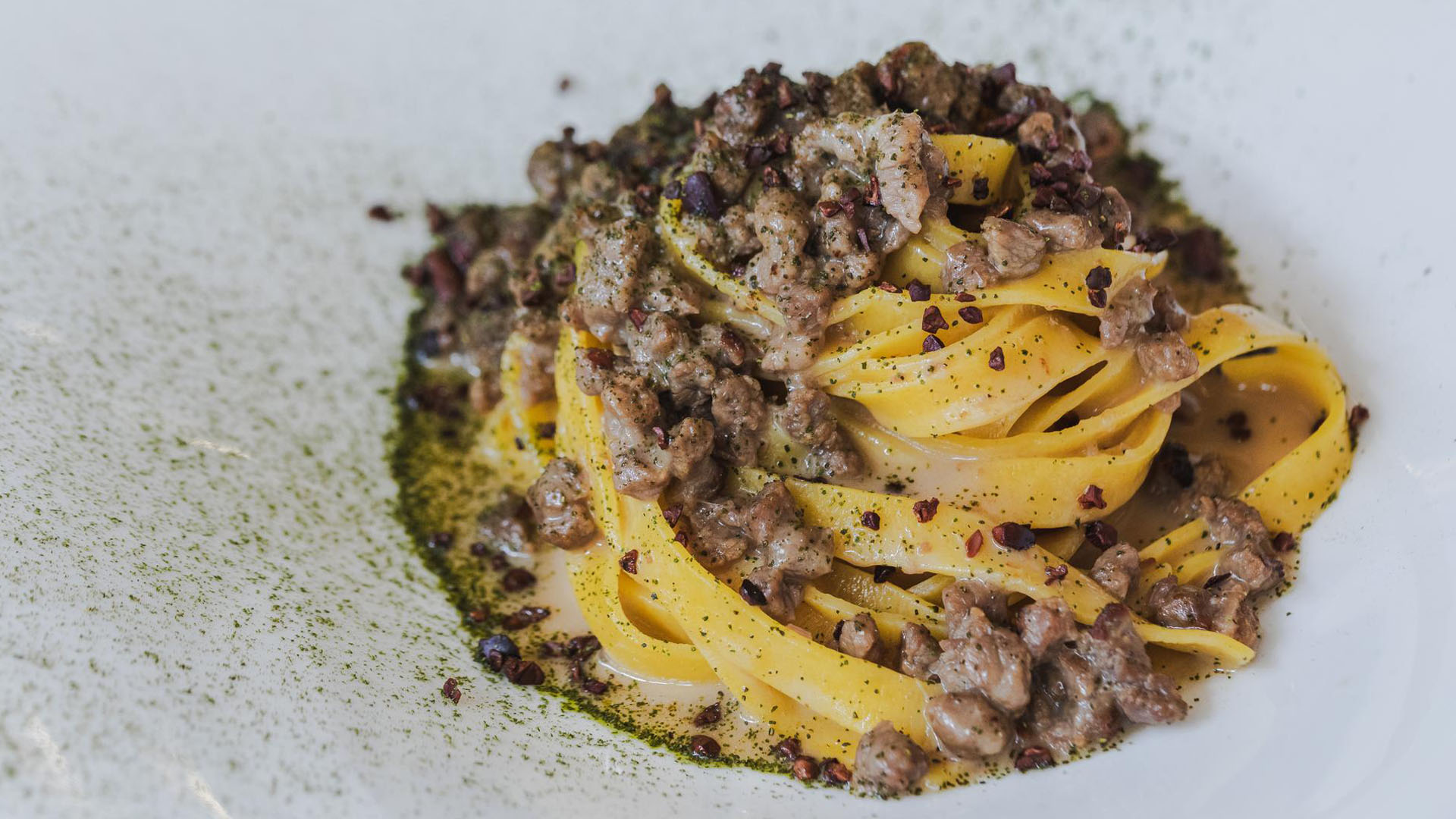 Le tagliatelle, ruvide e corpose, vengono cotte al dente e saltate con il ragù, completando la mantecatura con Parmigiano Reggiano e scorza di limone grattugiata. Il formaggio aggiunge rotondità, mentre il limone porta freschezza e vivacità, bilanciando i toni più intensi del cacao e della carne. Una sintesi armonica che rende il piatto completo e sorprendente.