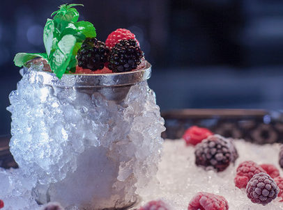 per ottenere l’effetto “crusta di ghiaccio” mantenere la Julep Mug immersa nel ghiaccio granulare mentre si prepara il drink