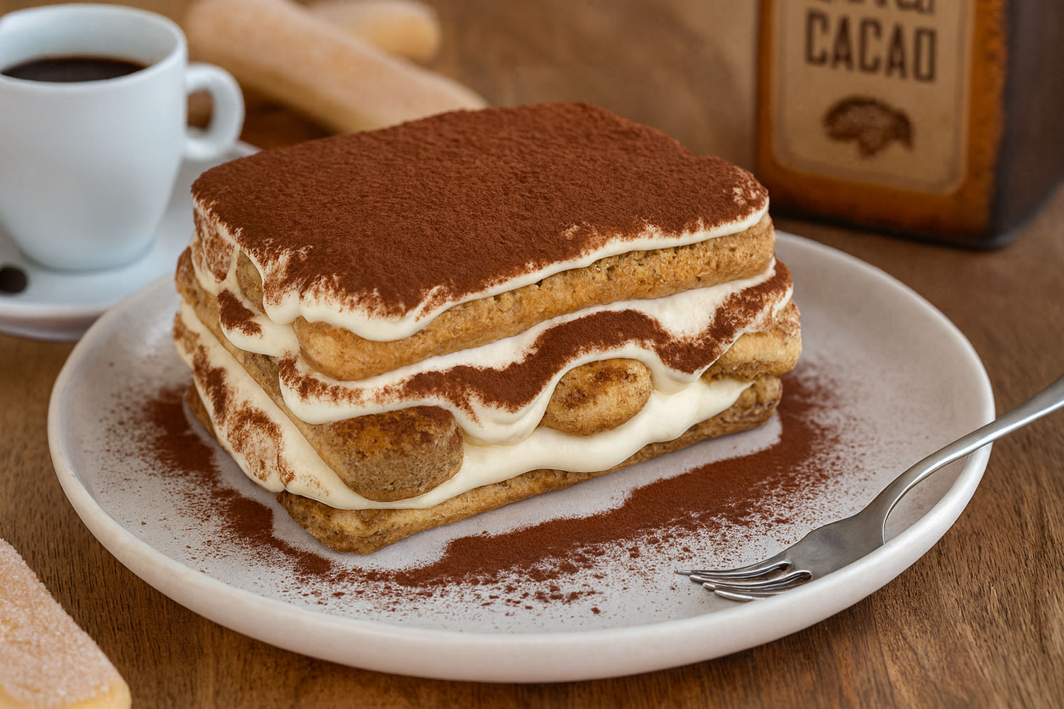 La ricetta originale prevede savoiardi, caffè espresso amaro, uova fresche, zucchero, mascarpone e cacao amaro. Non sono previsti liquori o panna, anche se alcune varianti regionali li includono per personalizzare il gusto.