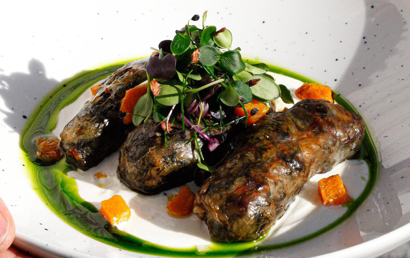 Si parte con il patè di fegatini accompagnati da crumble di Melomakarono, dolce secco che è un grande classico della tradizione, e pan brioche caramellato, per un gioco unico di sapori contrastanti. A seguire, la zuppa di zucca con castagne caramellate, pancetta di Salonicco e tartufo, tipico della stagione.