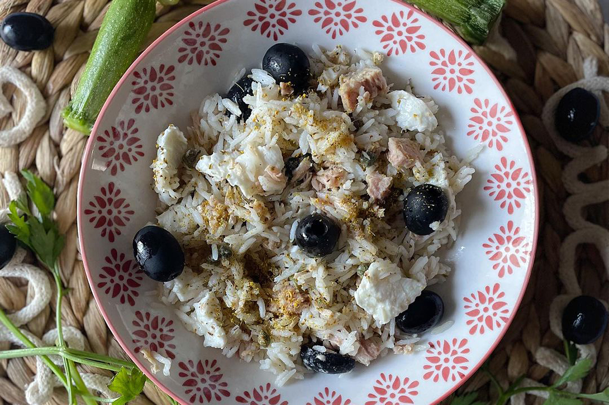 300 g di riso basmati, 150 g di primosale di capra, 2 scatolette di tonno al naturale , 100 g di olive nere denocciolate, capperi q.b, olio evo , sale q.b, 2 cucchiai di fiori di finocchietto selvatico fresco.