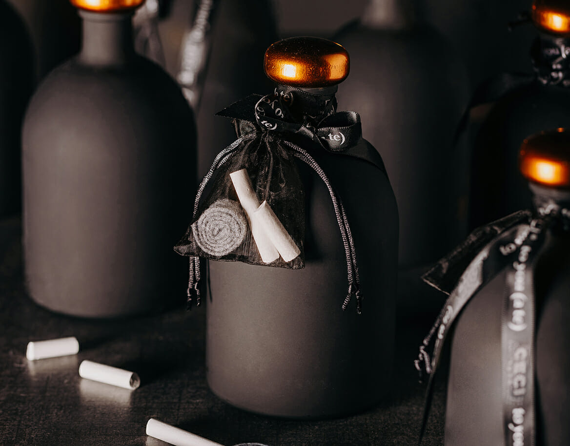TO YOU è presentato in una bottiglia di vetro nero opaco che diventa una vera e propria lavagna, una tela intonsa su cui scrivere o disegnare. In dotazione, con il vino, due gessi bianchi e un “cancellino”, il tipico di feltro arrotolato. Il tocco glamour è il sovra tappo color rame metallizzato con il logo CECI 1938. La bottiglia è chiusa da un tappo a corona.