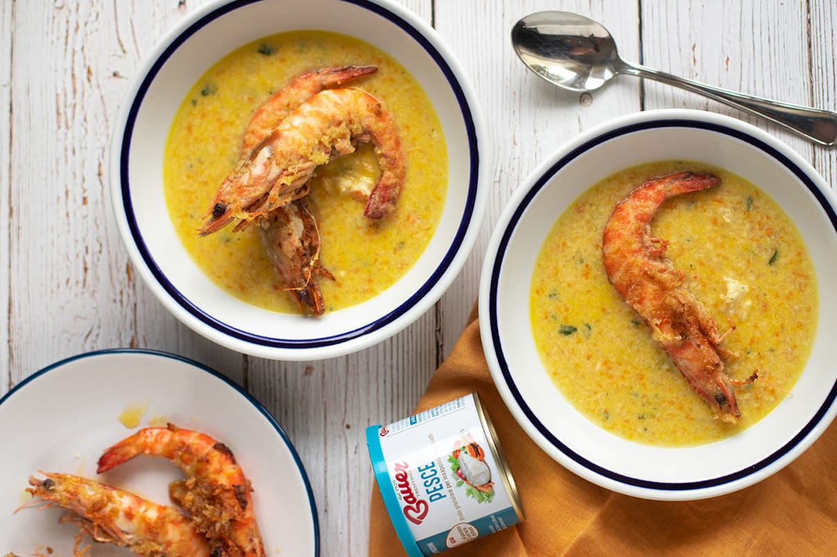 Dulcis in fundo, servire caldo in quattro fondine e adagiare su ciascuna un gambero spadellato.