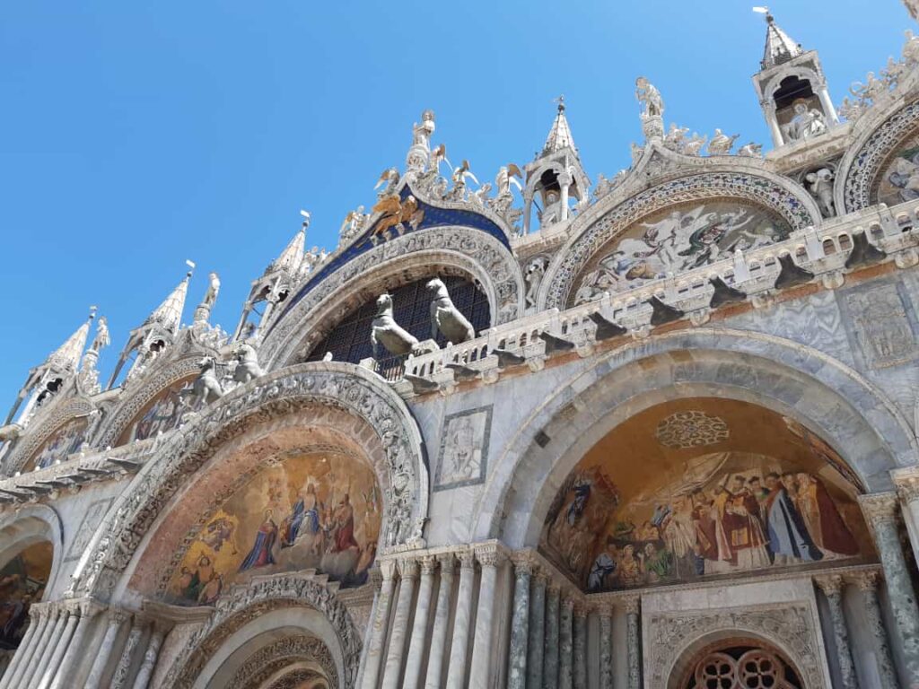il primo posto da vedere è Piazza San Marco, simbolo della città, con il campanile e la maestosa la Basilica di San Marco. Sopra la porta principale della basilica si trovano i quattro cavalli bronzei portati via dal palazzo imperiale di Costantinopoli, dopo la quarta crociata del 1204. L’architettura e le decorazioni sono esempio di incontro fra oriente e occidente. Accanto si trova Palazzo Ducale, con le sale del potere della Serenissima, un tempo era il palazzo dei Dogi, oggi accoglie i turisti, fra opere di Tiziano, Tiepolo, Paolo Veronese, Tintoretto.