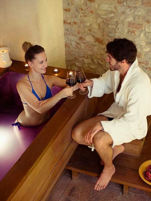 Il ‘Bagno nel Vino’ viene effettuato in una grande vasca dotata di idromassaggio nella quale viene versato, in aggiunta all’acqua, vino, lieviti e altri principi attivi contenuti nell’uva. La vino terapia in quest’area si deve prenotare anticipatamente e si può fare anche in coppia. Durante il bagno di coppia, verrà servito un calice di vino da sorseggiare, rilassandosi alla luce delle candele.