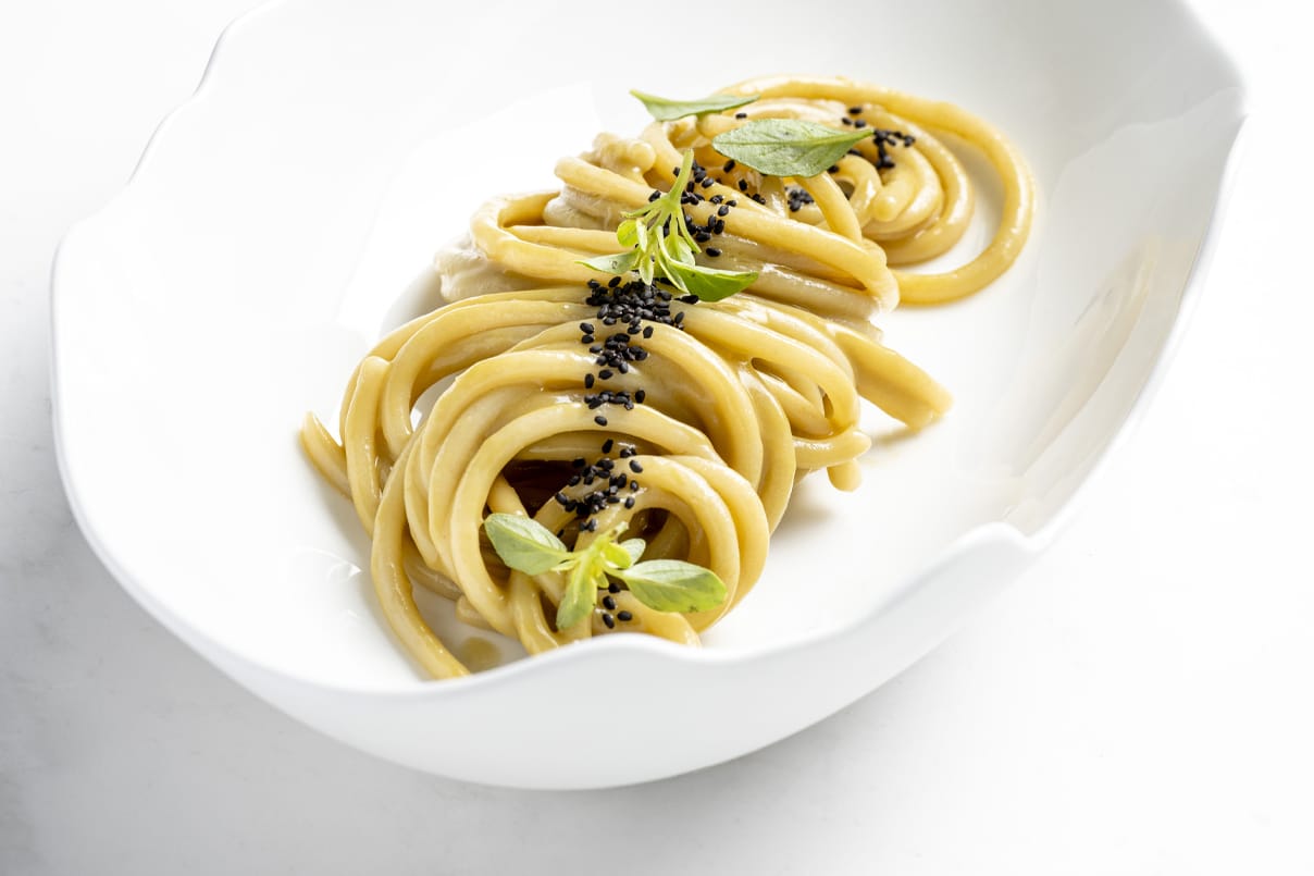 Il primo piatto menzionato nella scheda dalla Guida Michelin che è emblema dell’equilibrio fra la tecnica di cucina contemporanea e il sapore confortevole di quella casalinga.