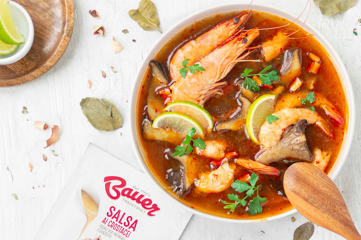 ● 10/12 code di gambero ● 100 g di funghi a scelta ● 1 cucchiaio di gambi di lemongrass a rondelle (fresco o essiccato) ● 4 fettine di zenzero a lamelle ● 4 foglie di kaffir lime essiccate ● 1 cipolla rossa ● 1 cucchiaino di pasta di peperoncino thai chili paste “nam prik pao” ● 4 cucchiai di Salsa ai Crostacei Bauer (20 g di preparato e 250 ml di acqua) ● 1 cucchiaio di olio di semi ● 2 lime ● 2 cucchiaini di zucchero integrale ● un mazzetto di prezzemolo o coriandolo |