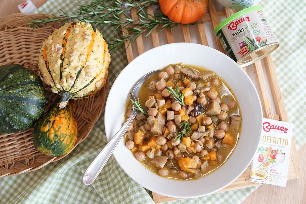 Zuppa di zucca, funghi carboncelli e ceci, al profumo di rosmarino con Granulare Vegetale Bio Bauer